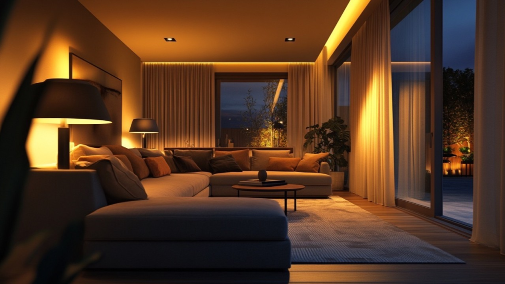 No harsh white glare. No clinical feeling. Instead, warm tones bounce gently off walls, fabrics, and wood surfaces.